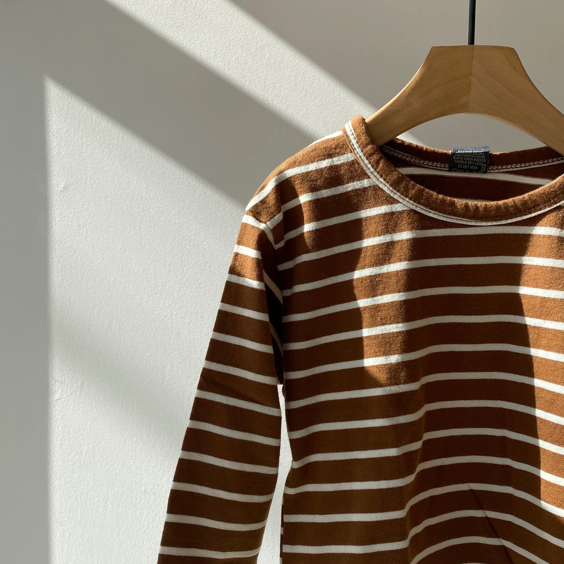 A warm-colored striped T-shirt perfect for autumn and winter, and can be worn on its own or as an inner layer.