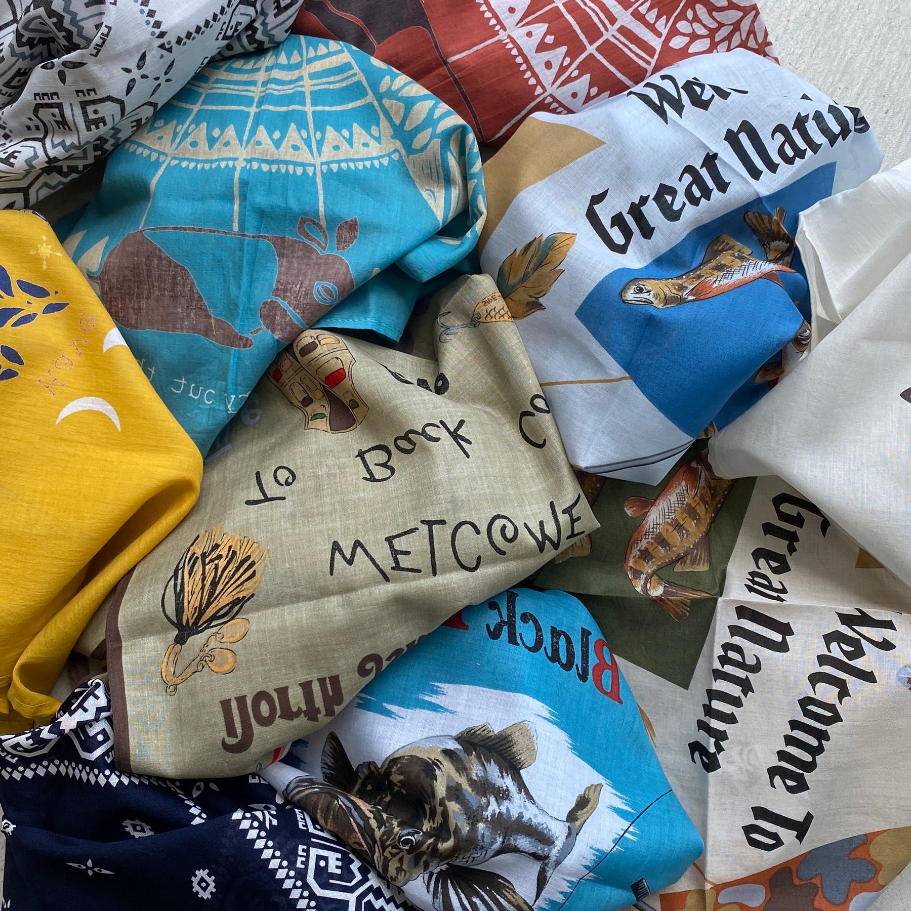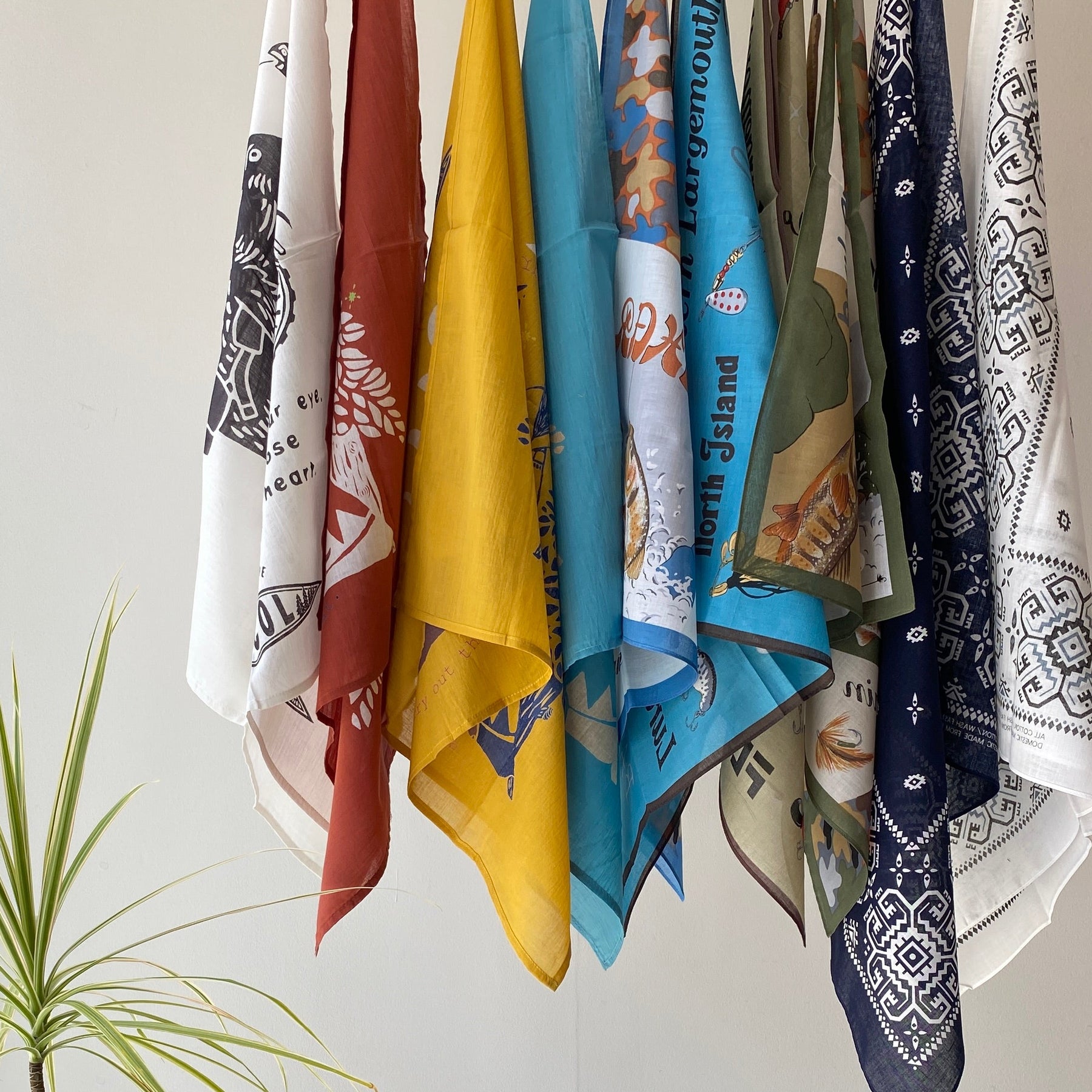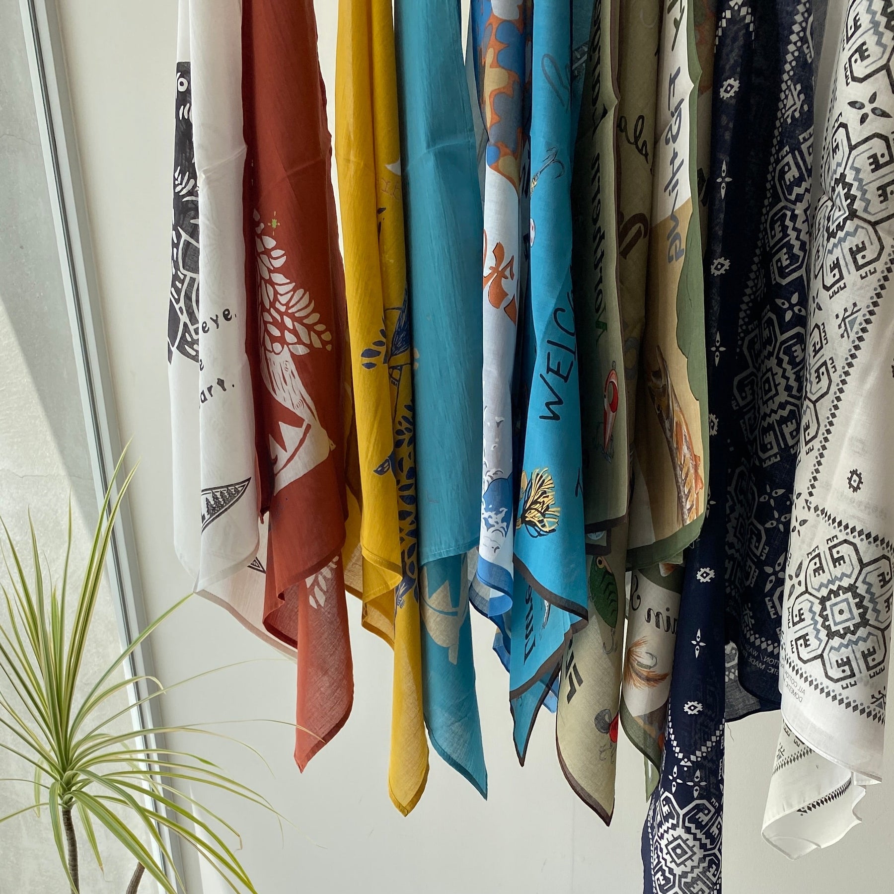 • 巻き方次第で自由自在なスタイリングが叶うアイテム 頭に巻いてバブーシュカとしてはもちろん キャップと合わせてストリートっぽく取り入れたり 首にネクタイ風にプラスするなどマルチに活躍 胸周りにつけてビスチェ風に、 腰に巻いたり垂らしたりコーディネートのポイント使いにもぴったり バッグにつけてたり、ピクニックに持って行ったりと いつものスタイリングにプラスするだけで トレンドのスタイリングに仕上がります。 ■素材:コットン100%