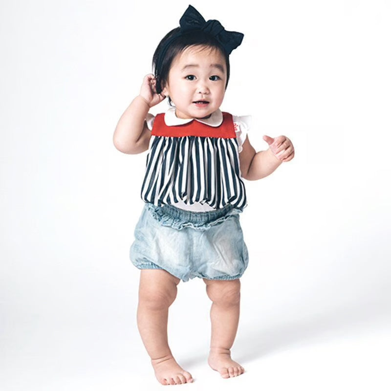 丸襟が女の子らしく、赤とストライプのコントラストが目を引くスタイ。