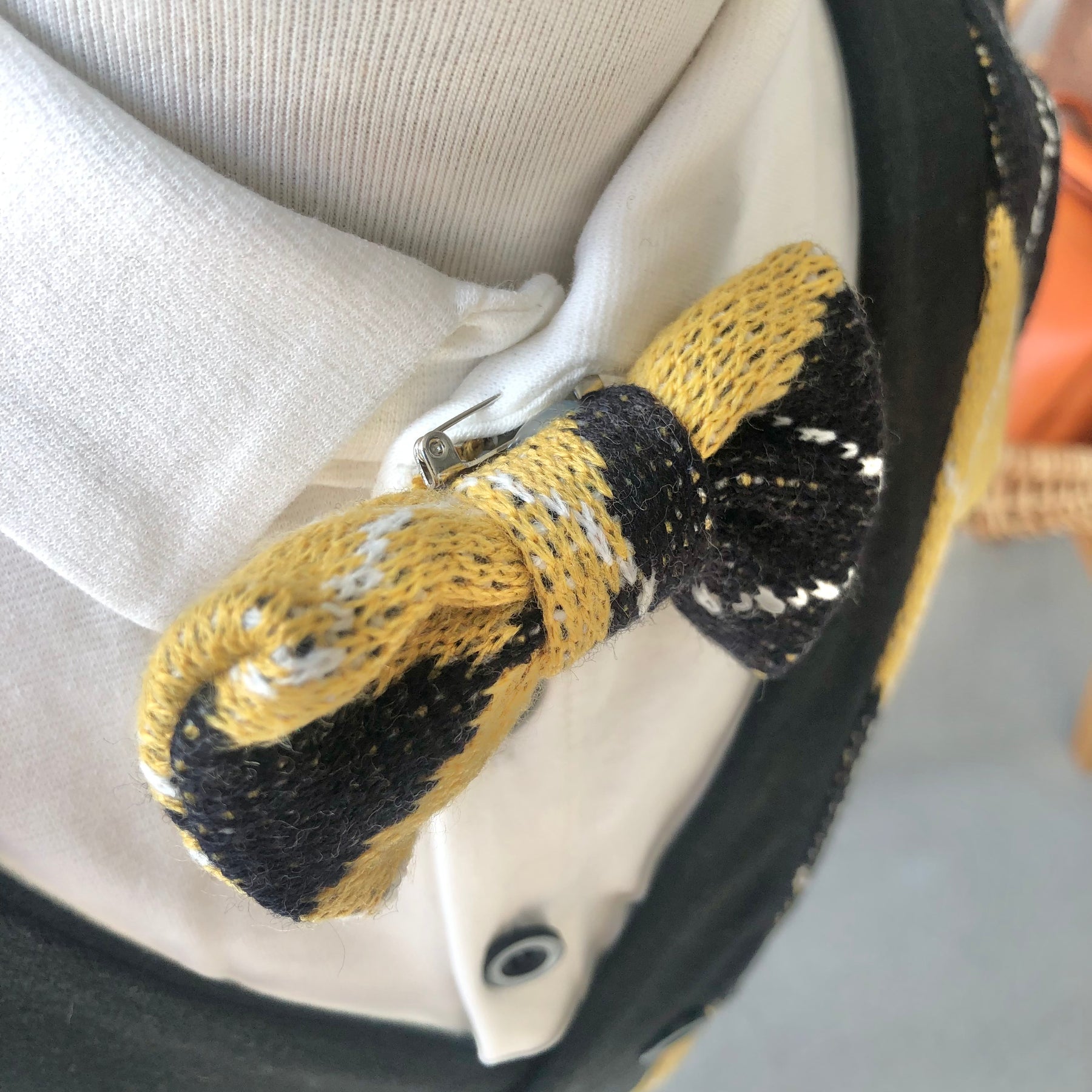 カジュアルなストライプシャツにストライプの蝶ネクタイ