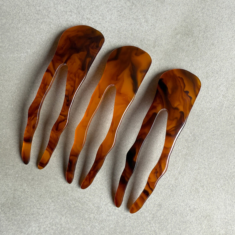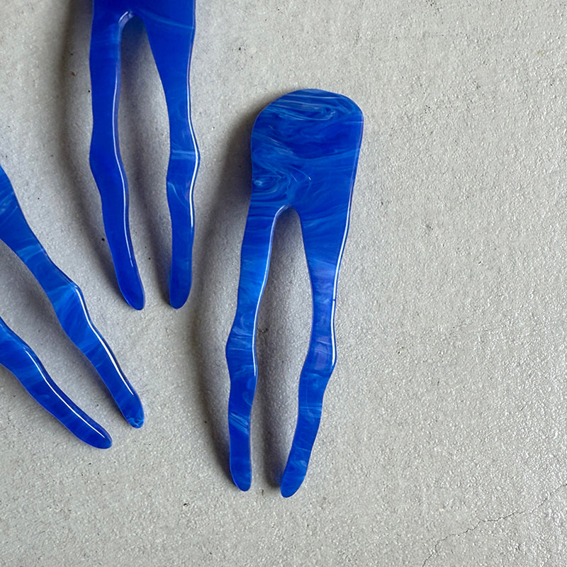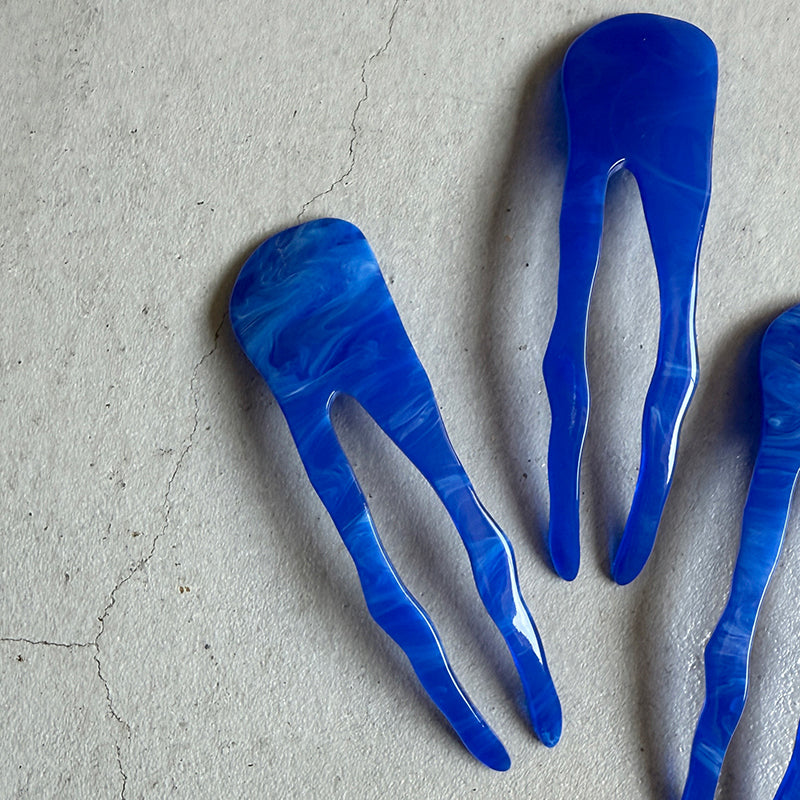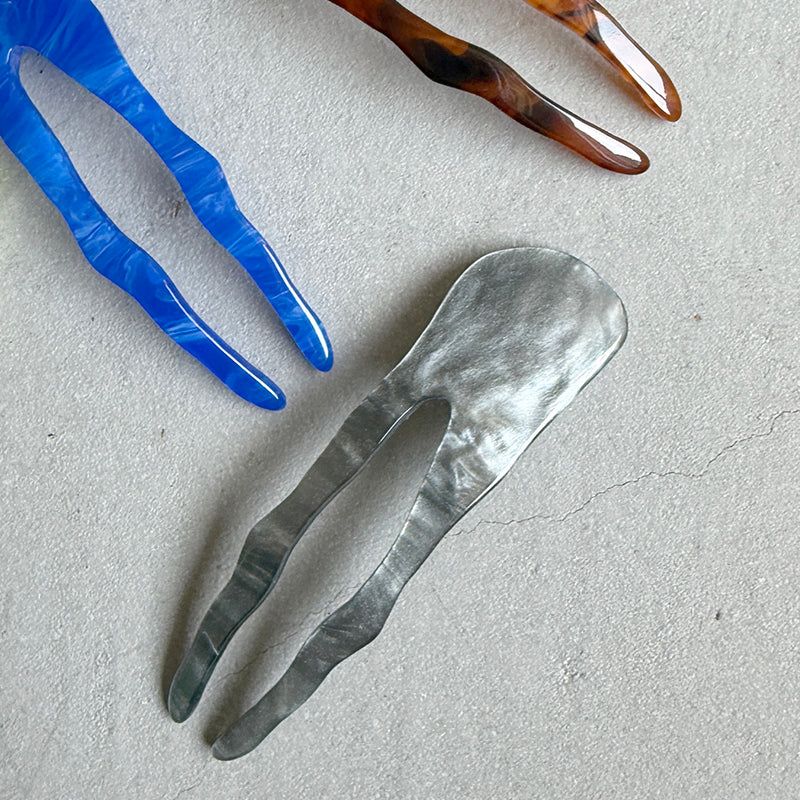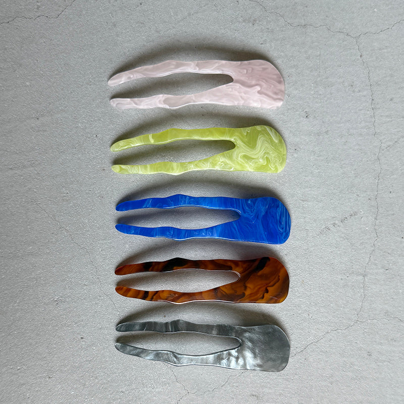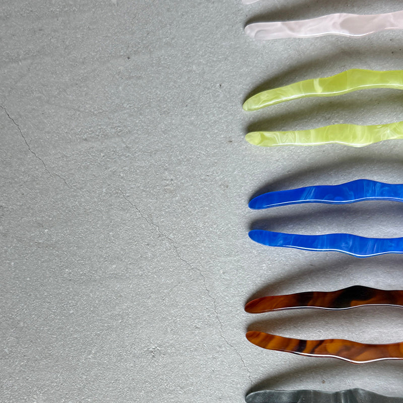 sAnオリジナルデザインのアクリル板を切り出し、曲げ、艶出しし 一点一点作り上げたヘアスティック。