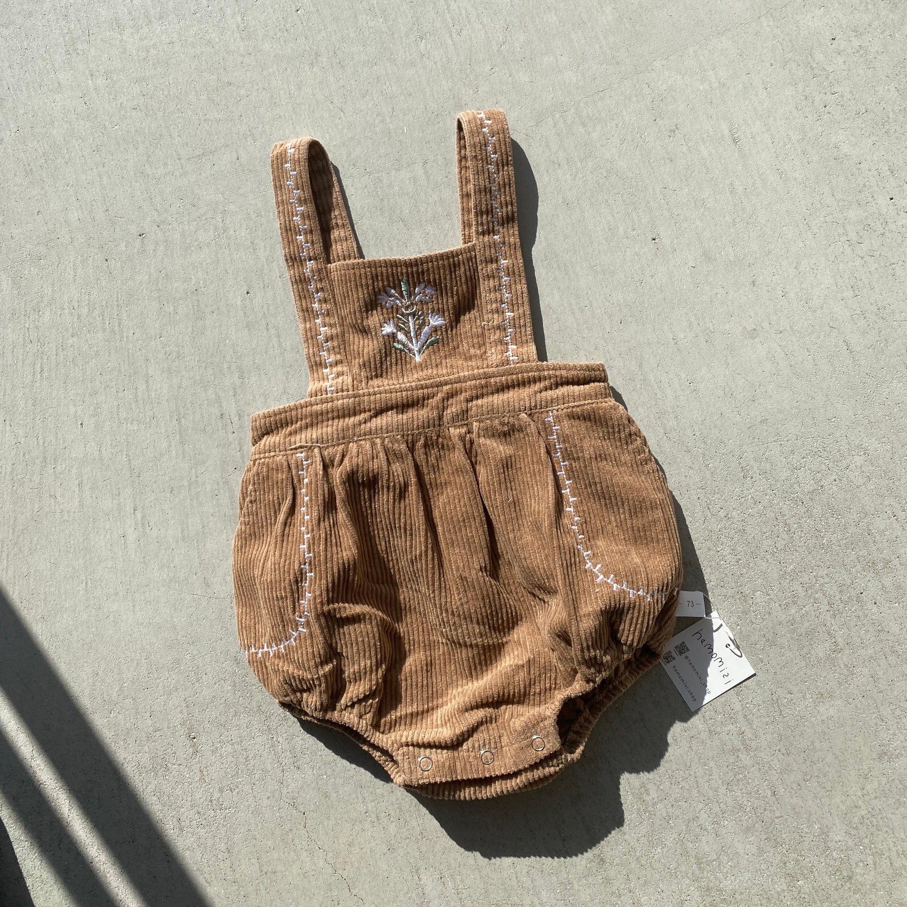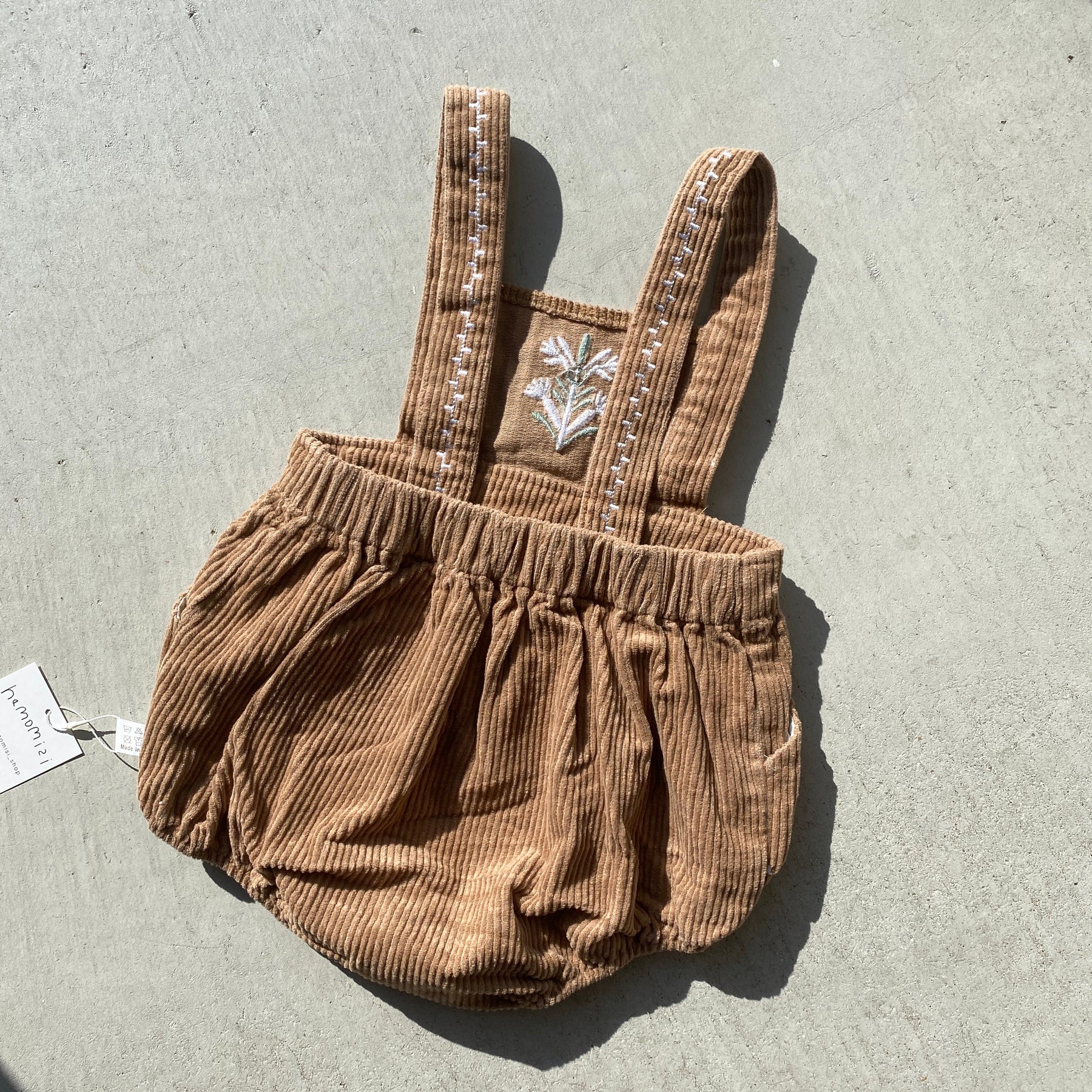 ナチュラルなカラーで胸元の刺繍がかわいいコーデュロイロンパース