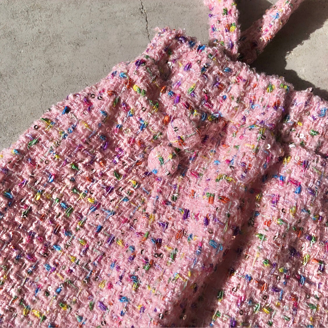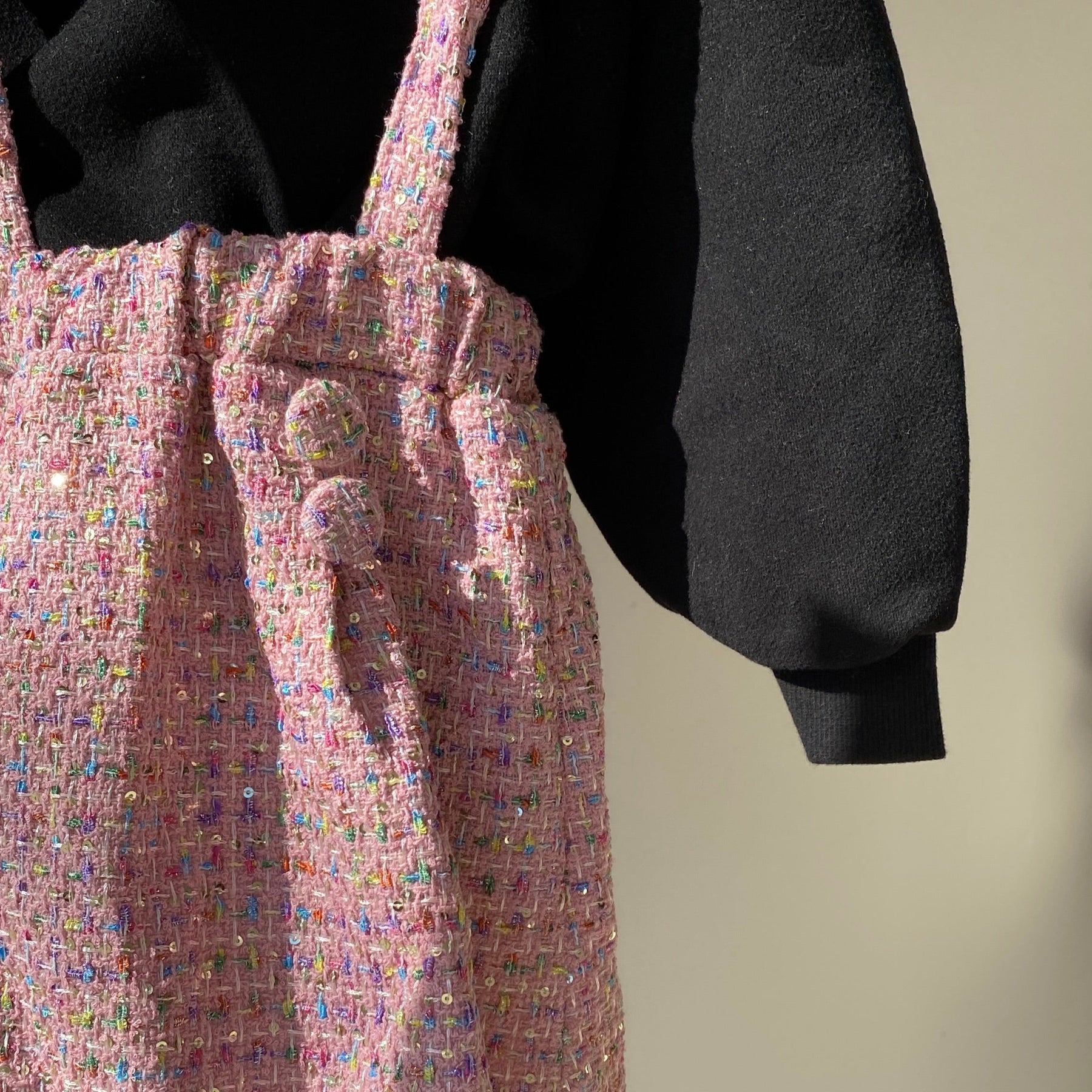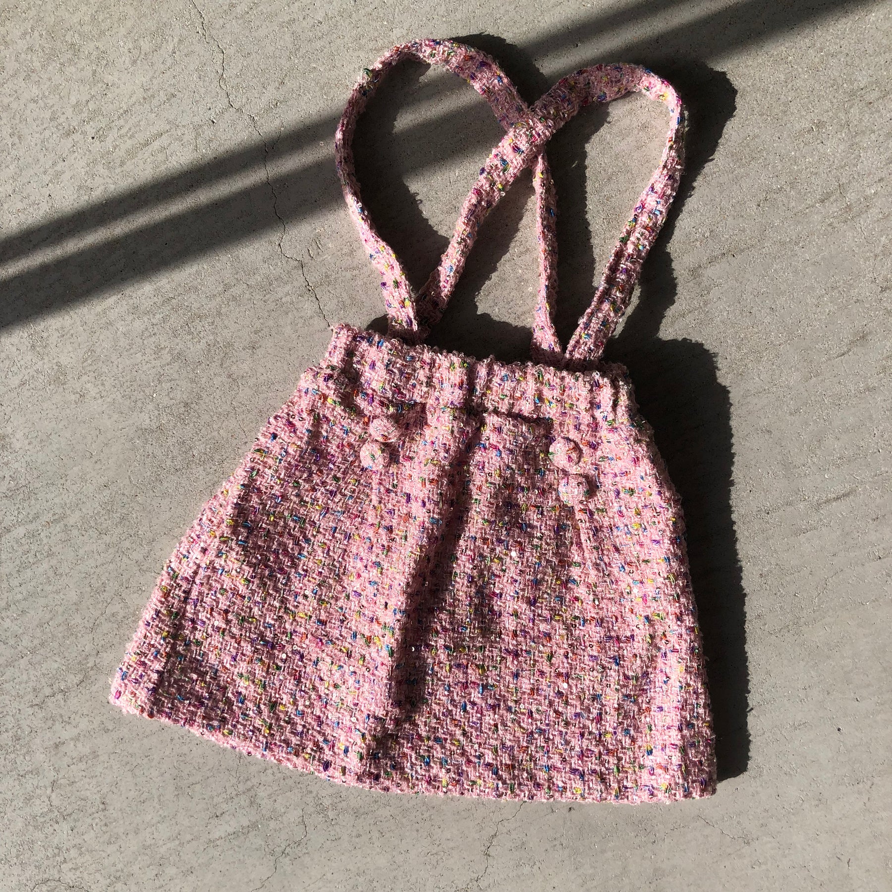 高級感を感じさせてくれるツイード素材で仕上げられたサスペンダー付きスカート